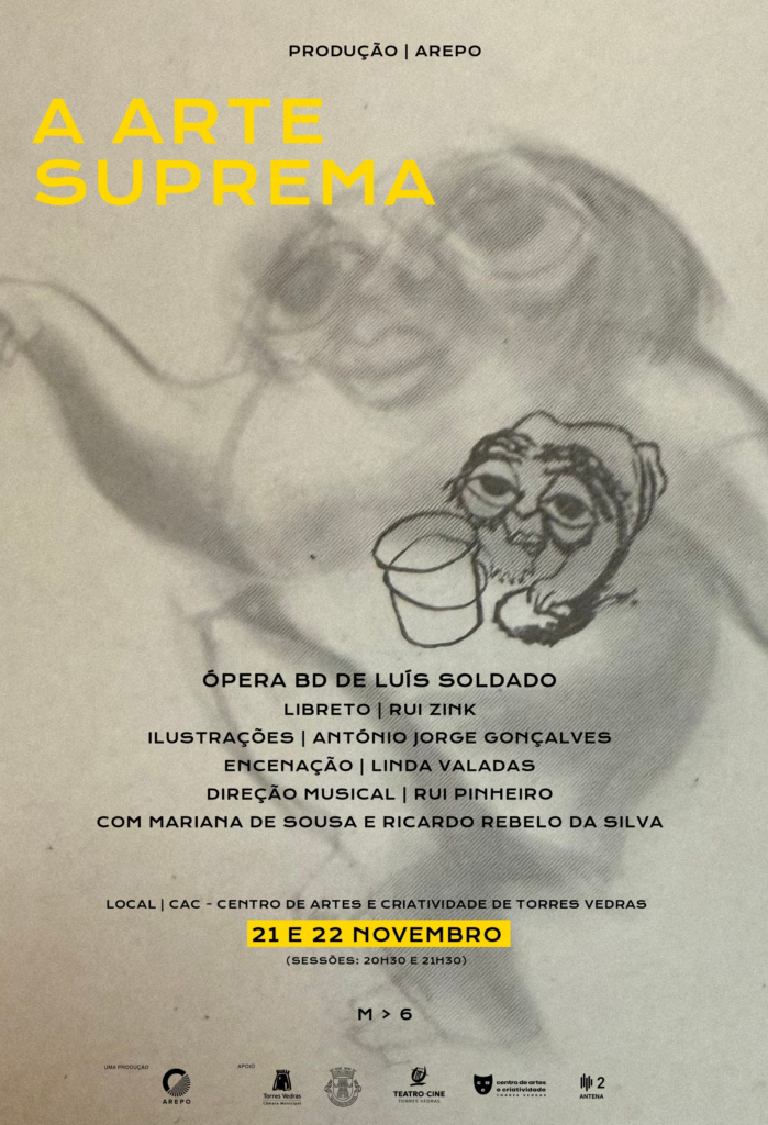 Depois de revisitar figuras femininas marginalizadas na sua trilogia dedicada a “mulheres escarnecidas”, a AREPO apresenta A Arte Suprema, uma ópera original inspirada na novela gráfica de Rui Zink e António Jorge Gonçalves. Com música de Luís Soldado, docente do Mestrado de Artes Cénicas da NOVA FCSH, e encenação de Linda Valadas. A estreia acontece a 21 e 22 de novembro no Centro de Artes e Criatividade de Torres Vedras e a 30 de novembro no Palácio Nacional de Mafra.